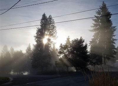 But some mornings, I get to rush out of the house to see the sun’s rays shimmering through a light fog. I can’t help it, I have to try to capture the beauty. Just as the sunrays that shine out of a sunset reminds me of the throne room of God, the radiant infusion through the fog in the morning does as well.