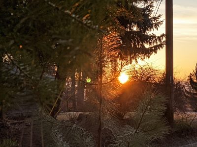 I woke up the other morning to the sunrise. A red ball shining through the trees, outlining the pine needles on the outstretched limbs with gilding. As I watched, the sun rays began to climb along the street and the lawns. The light yellowed from the flame, and the sky above grew pink and the day began.