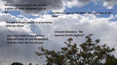 Oswald talks about God giving the vision “before a thing is made real.” What? But yes. He may put ideas into our heads that we think must be impossible. We can’t do that—can we? Still, if there is no vision, what kind of life lay before us? One with no meaning? Or no purpose? Or no direction? Who wants to live like that?